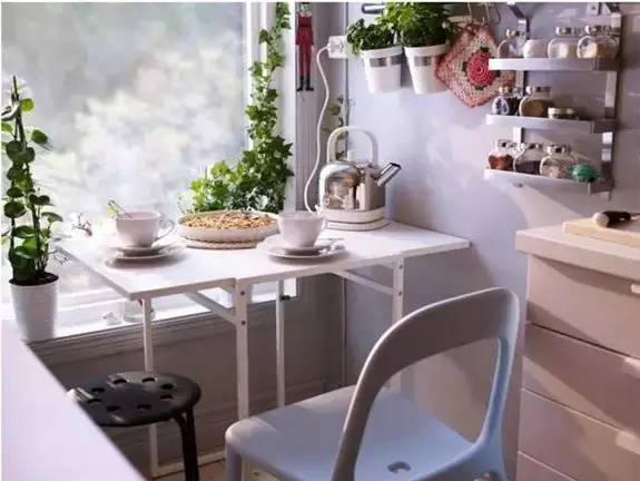 右上角的兩個(gè)小盆栽 它們將成為一道風(fēng)景線 小餐桌的空間就省下來了