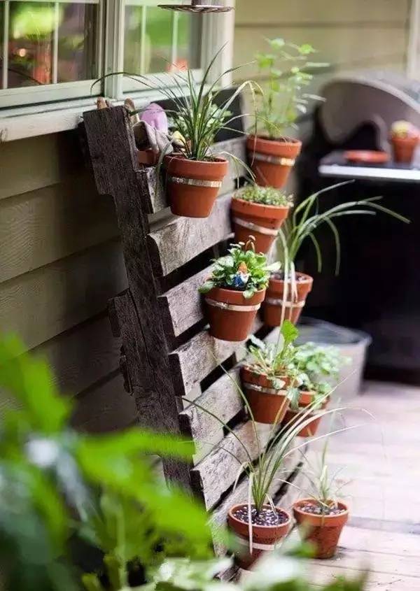 沒有花架,把一盆盆的小盆栽 直接固定在垂直的木板上也可以