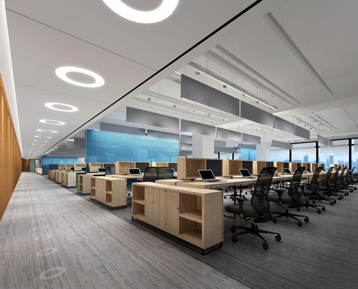 辦公室辦公區(qū)域設計:開放式的辦公區(qū)域,設計師采用加長版的辦公桌,在滿足辦公需求的同時,為企業(yè)打造人性化的辦公空間。