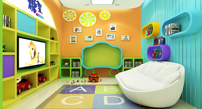 第一:設(shè)計(jì)作風(fēng)一定要合適小孩子的年齡特征,小孩子對(duì)顏色、幾何圖形等都很感興味,這些東西都很容易吸收他們的留意,所以,墻面、吊頂、家具等能夠注重外型的卡通化,顏色的強(qiáng)比照化。