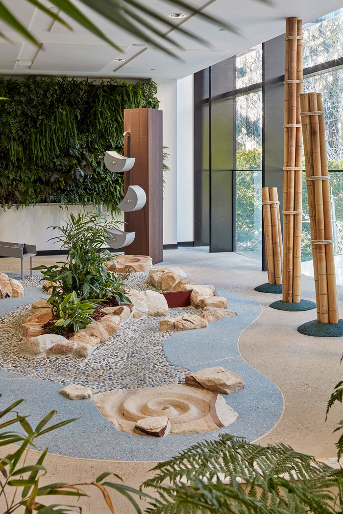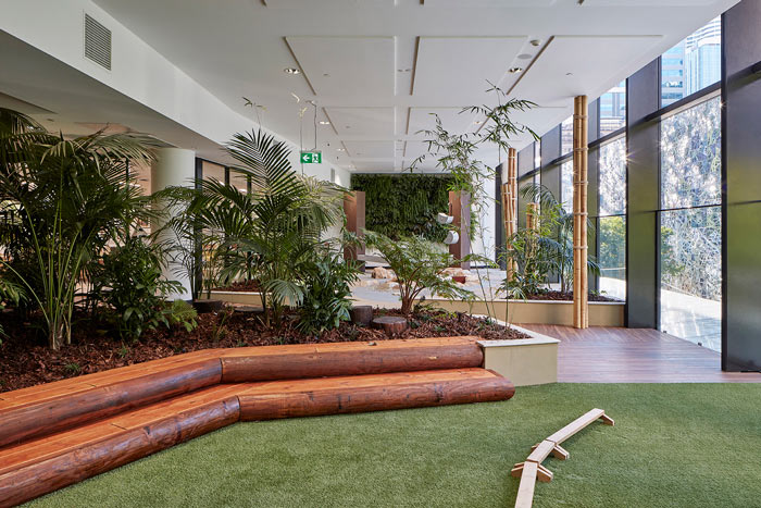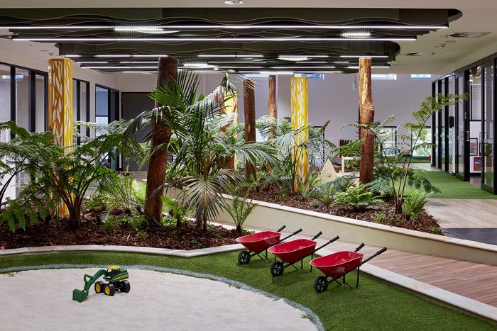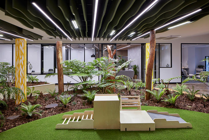 【早教中心裝修廳設(shè)計(jì)】心綠植:現(xiàn)在的小朋友已經(jīng)鮮少能夠見到泥土地了,設(shè)計(jì)師希望通過綠植室內(nèi)的栽植,讓孩子回歸自然、回歸先天,讓孩子在這樣的空間中感受到自然的魅力。