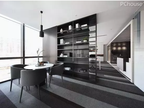 白色的調(diào)子是整個(gè)重新建構(gòu)的空間中保持穩(wěn)定的部分,而由定制水泥板、木質(zhì)造型的體塊、灰色玻璃、地毯、家私形成的不同色調(diào),不同質(zhì)感的灰色,就成了整個(gè)空間中最活潑的元素,與白色相得益彰。